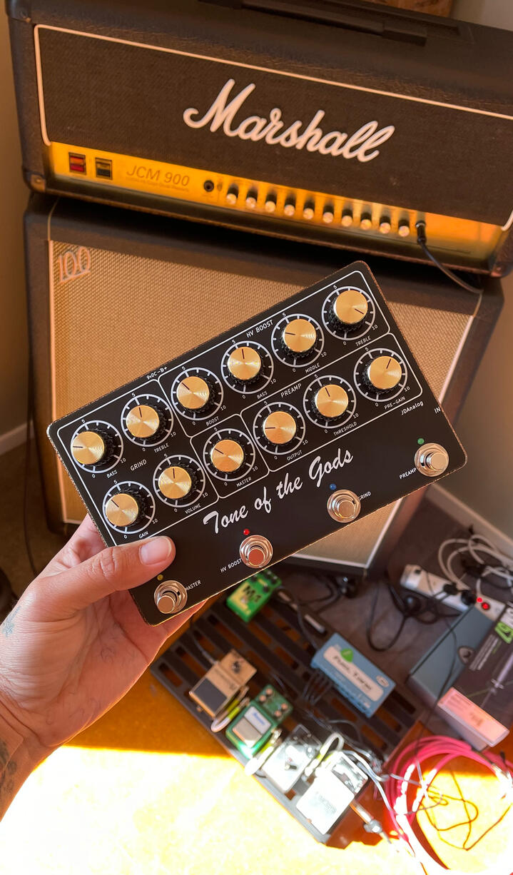 REVIEW from AUSSIE: I bought my "Tone Of The Gods" pedal from Jason at JD Analog last week and I expected it to be brilliant based on the demo video I'd just watched by Brett Kingman on his YouTube channel. I was NOT disappointed! This is an amazing and totally unique pedal. The "Tone Of The Gods" arrived very quickly and was very well packed. First impressions when I unpacked the pedal? Well, for a start off it's built like a Tank, but in a good way. Very sturdy construction and obviously built to last. In fact, I believe it comes with a 5 year warranty. The Tone Of The Gods looks great and the layout of the control knobs and switches is very practical and aesthetically pleasing. I really like the vintage look with the classic Marshall style control knobs. The 4 foot switches are very high quality and really solid. And there's no nasty noises when switching any of them on and off. The LED's look good too. But how does the "Tone Of The Gods" pedal sound? Well, simply magnificent! I can't stop playing it. This pedal is totally addictive and it completely blows away many of my other overdrive and "Amp in a Box" pedals. In fact I'll be selling quite a few of my old pedals because the "Tone Of The Gods" has made them completely redundant and surplus to requirements. So, the "Tone Of The Gods" is worth every cent in my opinion. In fact, I'll probably end up better off financially by the time I've sold some of my other superfluous pedals. I have now had some time testing the "Tone Of The Gods" pedal with my various guitars and a couple of very different amplifiers. One amplifier was a very clean Fender style 50 Watt Head (6L6 Output Valves) through a closed back Celestion Alnico Cream 12 inch cab. The other amplifier was a slightly crunchy sounding clone of a Matchless 30 watt head (EL84 Output Valves) through a Celestion Alnico Gold 12 inch closed back cab. I played a Stratocaster with SSS pickup configuration, Telecaster, Les Paul with P90's, Les Paul with Humbuckers, SG with Filtertron pickups and a Strat with Mini Humbuckers through both of these amps with no reverb, delay or any other FX. I just wanted to hear what the "Tone Of The Gods" pedal was doing. It didn't take me long to realise how much better everything I was playing sounded. This pedal worked equally brilliantly with my clean and crunchy amps and all the different guitars and pickup configurations I mentioned earlier sounded magnificent. Nothing sounded bad. I just couldn't stop playing it and experimenting with all the options it has. It sounds incredible, so articulate, so rich, so much bottom end but also sparkling tops. And the GRIND (overdrive) is gorgeous. Really thick and rich with great overtones when pushing the valve amps input. Searing Lead & Fat Punchy Rhythm tones. And yet, If you roll back the volume on your guitar it cleans up beautifully. Nothing is lost. It's an absolute Tone Monster. I love it! I've finally found my sound! I spent a long time adjusting and combining the PREAMP section with the GRIND section and also adding the HV BOOST section. It's an incredibly responsive pedal and all the sections interact beautifully. The combinations are seemingly endless and there's an excellent detailed PDF Manual and a Quick Start guide that you can download as a great starting point for your journey into "TONAL BLISS''. The range of sounds you can get is unbelievable. I should also mention the Master Volume Control because it's a great way to set up another switchable level control. Very innovative but also intuitive to use. You'll quickly get the hang of how everything interacts. I've been playing for a long time, mostly Blues and Classic 60's & 70's Rock and back in 1978 I used to have an old Marshall JMP 2104 Master Volume Lead 50 Watt 2 x 12" Combo. I have never found Lead & Rhythm Tones like it since.... Until Now. I've also owned a JTM45 and various Marshall Amps including a JCM 800 and a DSL 401 Combo. You can get all of those amp tones out of this pedal. But it's not just Marshall tones. This pedal sounds awesome with my Fender and Matchless style amps. Personally, I think it would work with anything. I have to say that I'm not a Metal player but I reckon you could get that sound out of this pedal with the right amp and speaker combination and maybe a distortion pedal. Jason has done an amazing job. And I really hope that he gets the recognition and accolades he deserves for this masterpiece. And no, I'm not being paid to write all of this gushing complimentary stuff. I am now a genuine believer. But you need to find out for yourself. So watch Brett Kingman's demo video on his YouTube channel for a start. And I believe Pete Thorn and Shane from "In The Blues" are doing demos soon. And some other highly regarded Guitarists will also be doing demos of the "Tone Of The Gods" pedal in the near future.